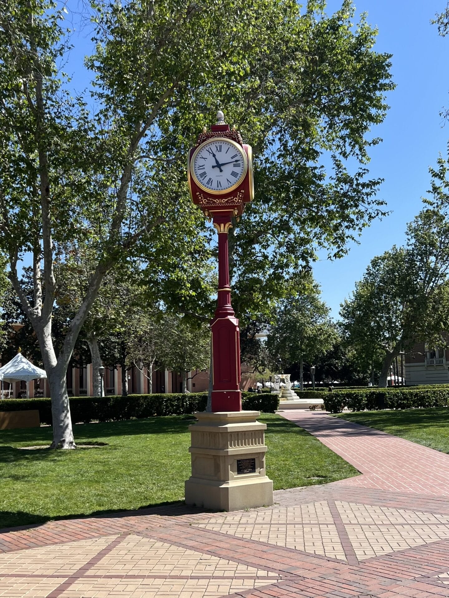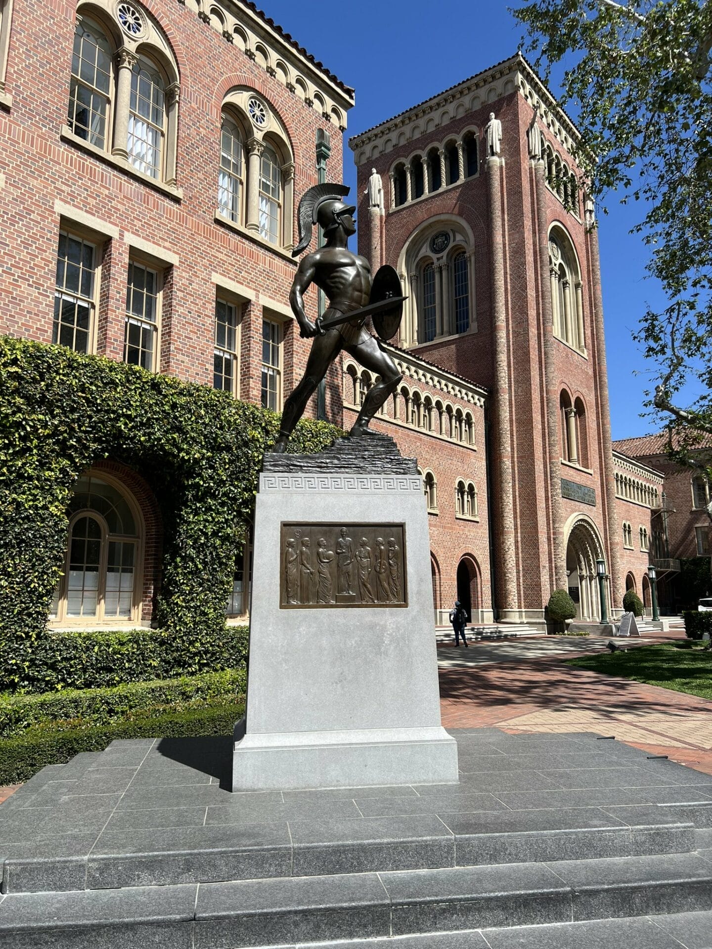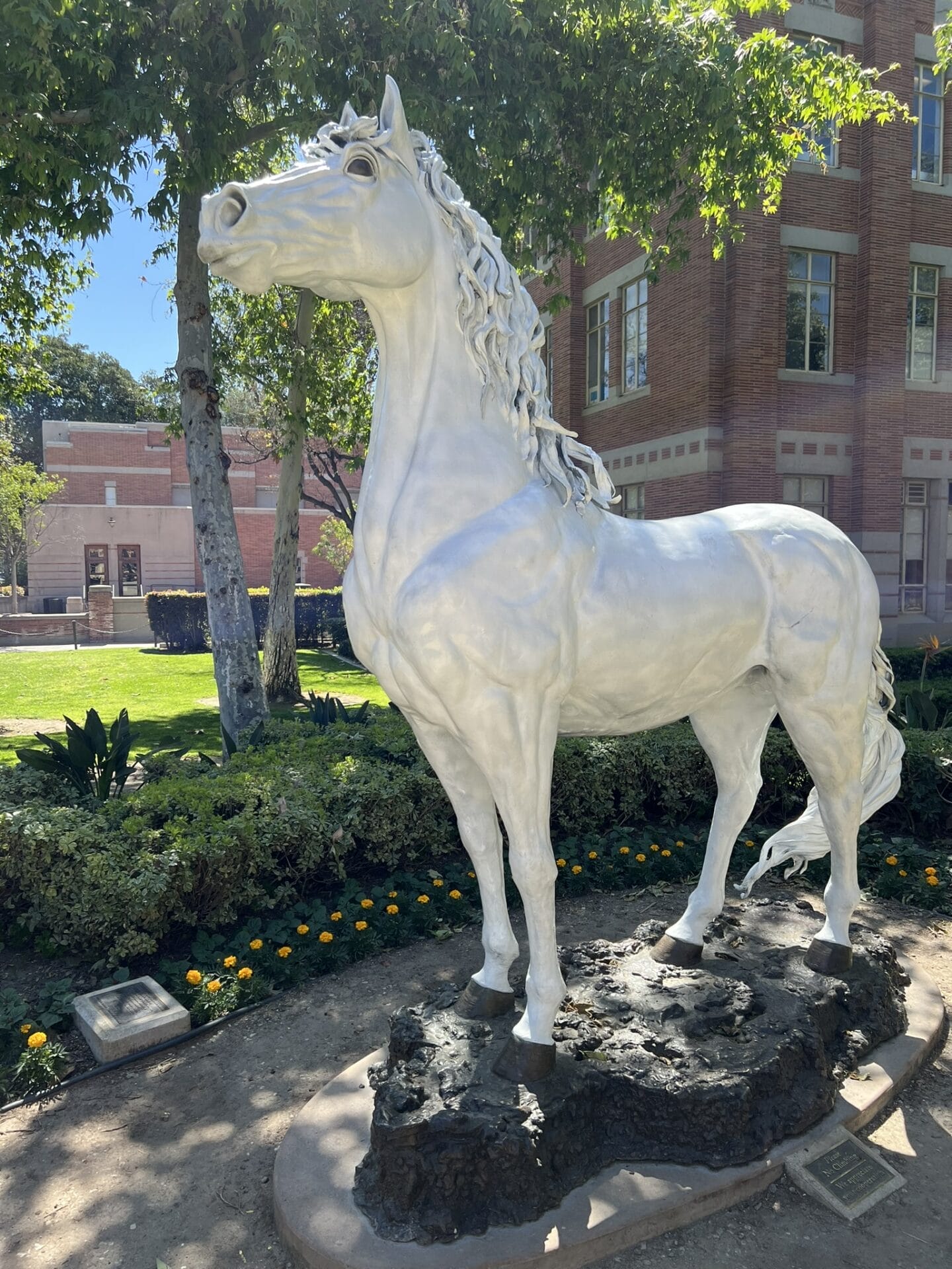 Lorsque vous êtes à la statue, la vue à 360° est très sympathique ! Vous apercevrez la belle fontaine Patsy and Forrest Shumway, une horloge, ou encore la mascotte de la fac (et non ce n’est pas la statue Tommy Trojan) : Traveler, un cheval blanc.